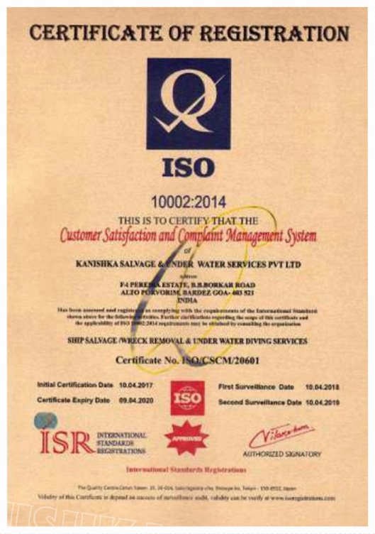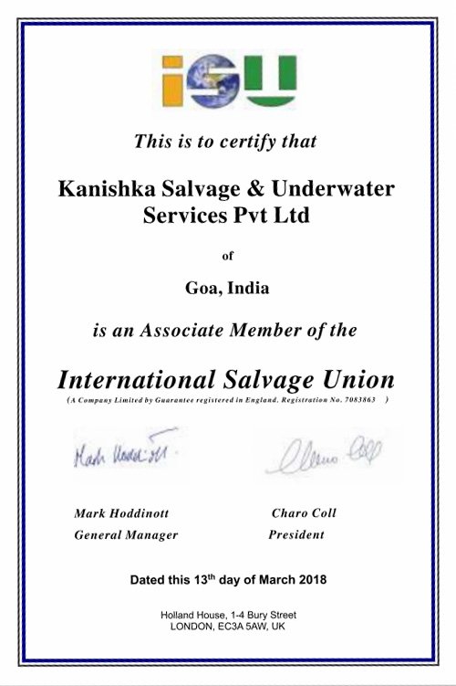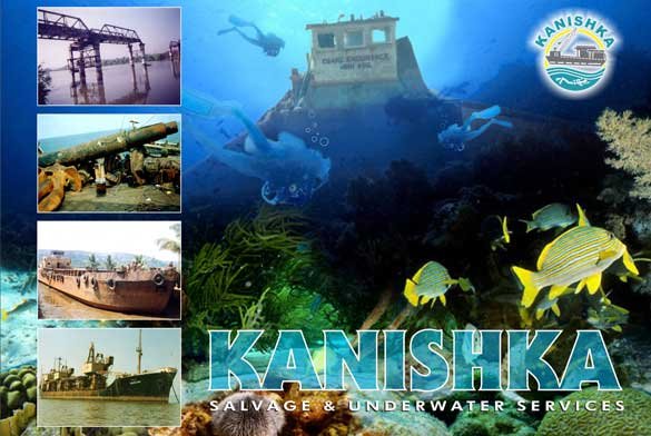 Kanishka Salvage & Under Water Services is a Private Limited Company offering numerous services to the maritime sector. Established in 1996 with head office at Goa. The Company's line of business includes Ships salvage, Wreck removal, Dredging and under water services.